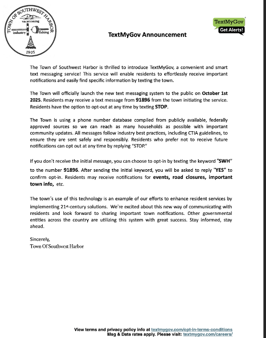 The Town of Southwest Harbor is thrilled to introduce TextMyGov, a convenient and smart text messaging service! This service will enable residents to effortlessly receive important notifications and easily find specific information by texting the town.